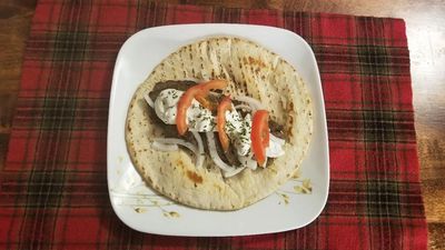 Pre heat oven to 325° take out of refrigerator and pack into bread loaf pan (spray pan with non-stick spray). Make sure the mixture has filled the corners of the loaf pan and packed in good. Place loaf pan in a larger pan filled with boiling water (water bath cooking method). Cook 60 to 70 minutes or until internal temperature reaches 165° Cool slick thin and re-heat by frying in a lightly oiled pan. Serve on grilled peta bread with sliced onions, tomato and tzatziki sauce.